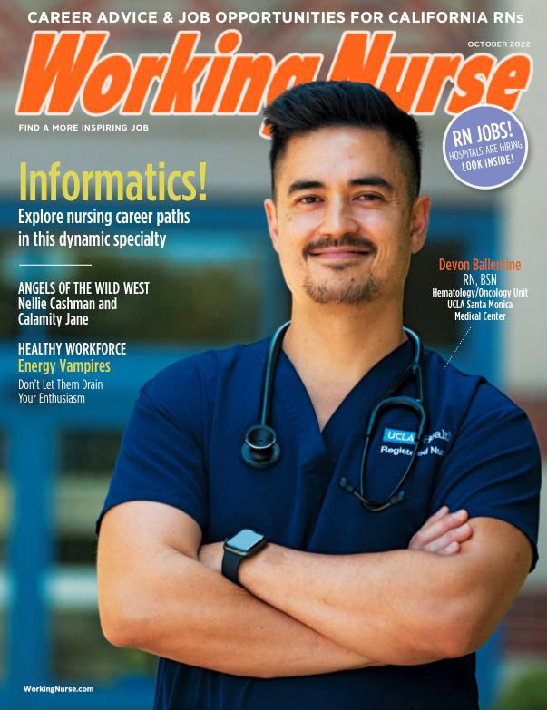 Results for: "Working Nurse" Clear search743 articlesMen In Nursing 2022Men In Nursing 2022Annual Special FeatureWorking Nurse talked to 17 nurses at local hospitals about inspiring moments, exciting specialties, and the hobbies that keep them sane. To see our panel engaging in their hobbies —...WorkingNurse239FeatureNursing InformaticsExploring career paths in a high-demand specialty...“Now, we have nurses in every nook and cranny of the organization,” Pollack explains. “They are programmers, educators and data scientists. Even the director of business operations is a nurse....Nursing Book ClubHer Hidden Genius by Marie BenedictThis historical novel looks at the dark side of the discovery of DNA...a woman working in a male-dominated field in the 1950s, made her an easy target for exploitation. Although Franklin died of cancer and pneumonia in 1958 (possibly as a result...Profiles In NursingNursing in the Wild WestThe true tales of Calamity Jane and Nellie Cashman...she called home. ELIZABETH HANINK RN, BSN, PHN, is a Working Nurse staff writer with extensive hospital and community-based nursing experience. MERRITT HENSON, RN, BSN, OCN, SANE, is a registered...